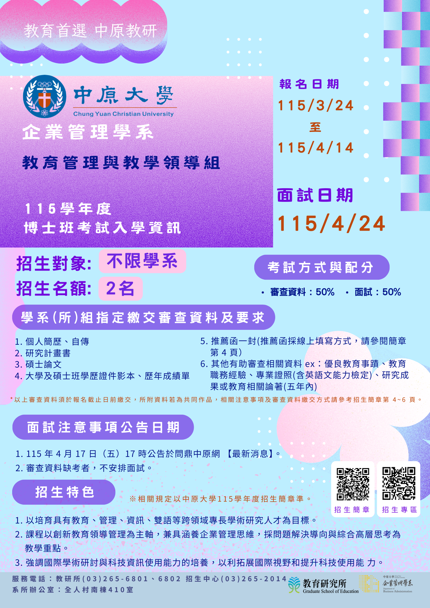 115學年度企管系博士班「教育管理與教學領導組」招生資訊 2026-03-03 109學年度企管系博士班「教育管理與教學領導組」招生資訊 / 招生資訊 您想掌握企業管理的最新脈動嗎?您想了解教育經營的創新思維嗎?中原大學開設全國唯一教育領導結合企業管理的跨領域博士學程由教育研究所與企業管理系雙聯師資授課畢業可以獲得獲AACSB國際認證的管理博士教育界的朋友,歡迎來1111人力銀行、遠見雜誌二項企業雇主評價私校雙第一,全國唯一將全人教育做為設校宗旨的中原大學就讀!115學年度招生簡章下載,請參見本校招生專區「問鼎中原網」 https://icare.cycu.edu.tw You Might Also Like 110學年度企管系博士班「教育管理與教學領導組」招生資訊 2021-03-03 112學年度教育研究所碩士班考試入學招生公告 2022-09-29 114學年度教育研究所碩專班考試入學招生公告 2025-01-10